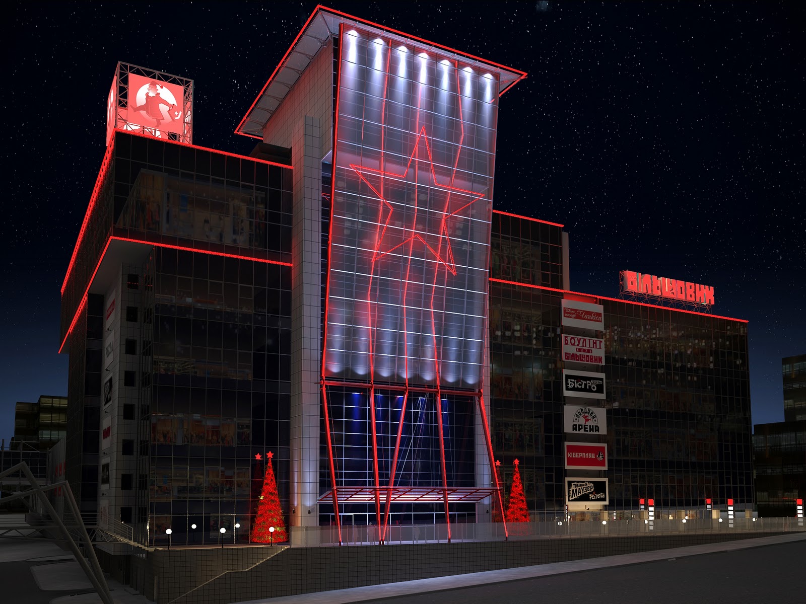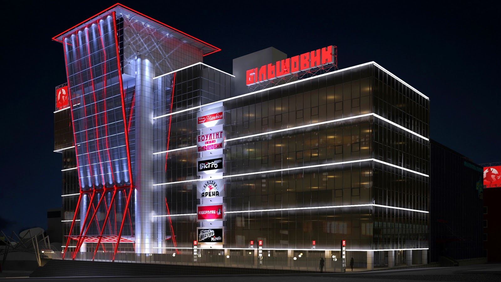 Архитектурное освещение фасада. ТРЦ "Большевик" г.Киев